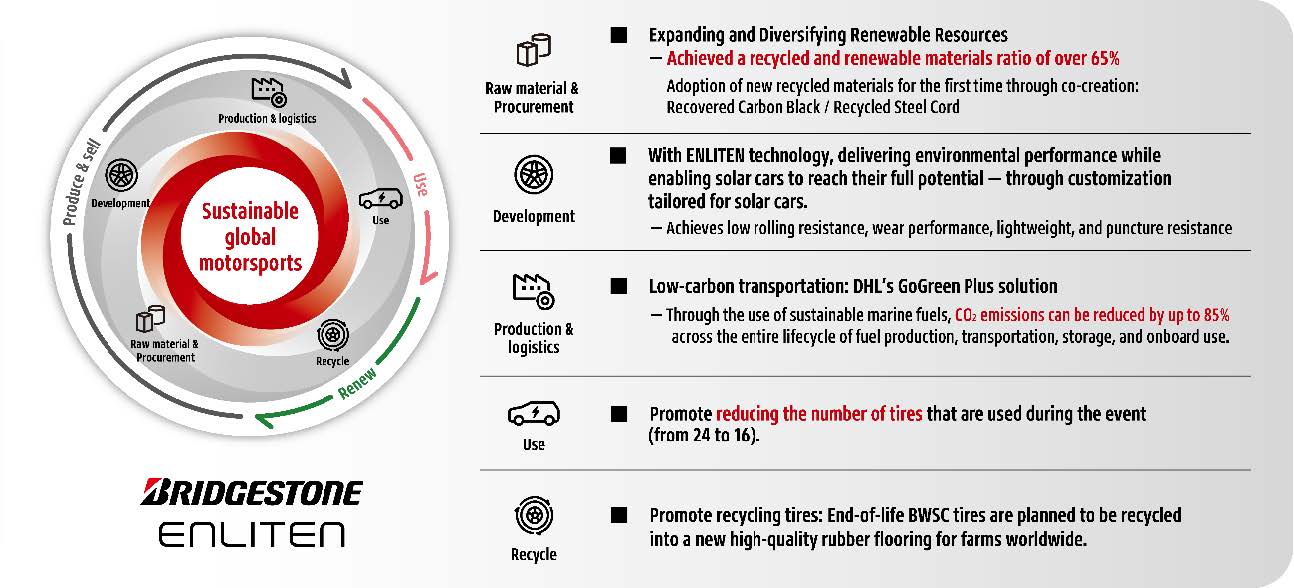 Untuk pertama kalinya, Bridgestone menerapkan carbon black hasil daur ulang dan baja daur ulang — yang dikembangkan dan diproduksi melalui kerja sama dengan mitra — pada ban BWSC. Selain itu, Bridgestone juga mengurangi jumlah ban yang digunakan selama acara, menerapkan logistik rendah karbon, serta mempromosikan daur ulang pasca-pemakaian. Upaya ini menandai evolusi langkah keberlanjutan Bridgestone di sepanjang rantai nilai ban BWSC. Secara khusus, tim yang menggunakan ban berteknologi ENLITEN berhasil meraih kemenangan di kelas Challenger dan Cruiser.